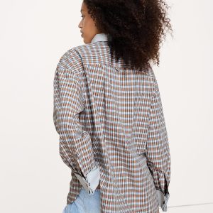 Also known as a \”Banker collar\” shirt, we reimagined this classic silhouette with its distinctive contrast collar and cuffs as an oversized tunic, in our signature 100% cotton poplin.