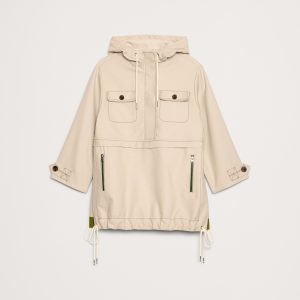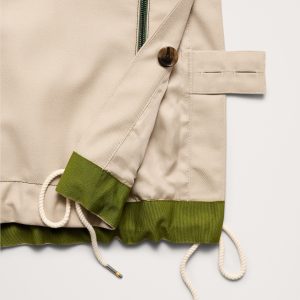 Zip and snap front closure. Drawstring hood.