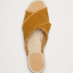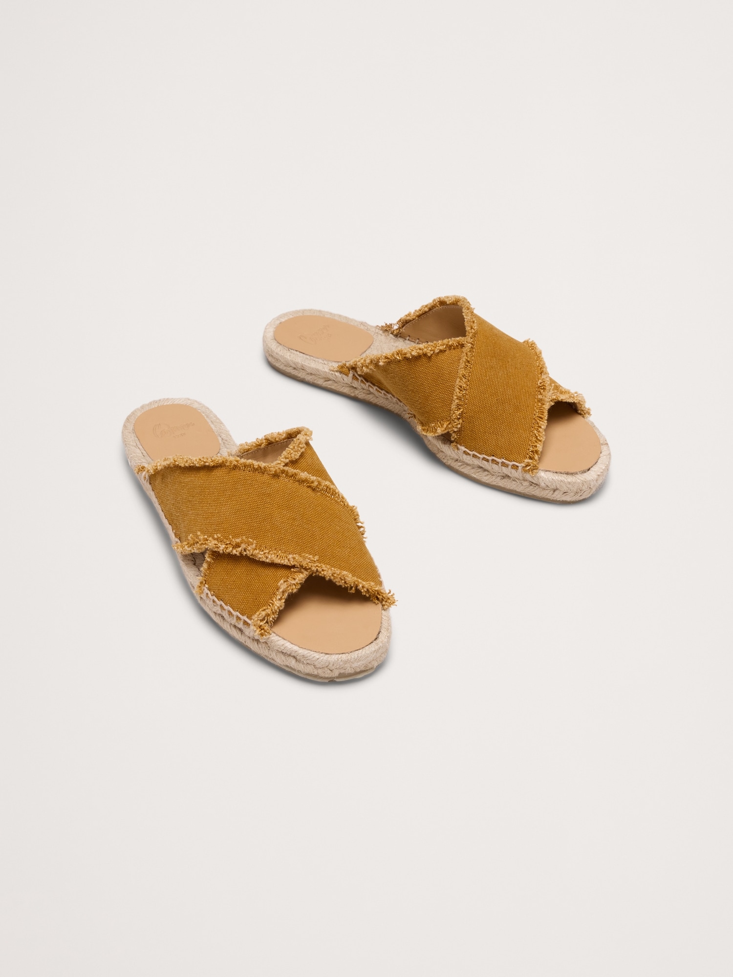Classic, crossover sandals constructed in the way of traditional with organic cotton canvas, leather lining, and braided jute insoles.