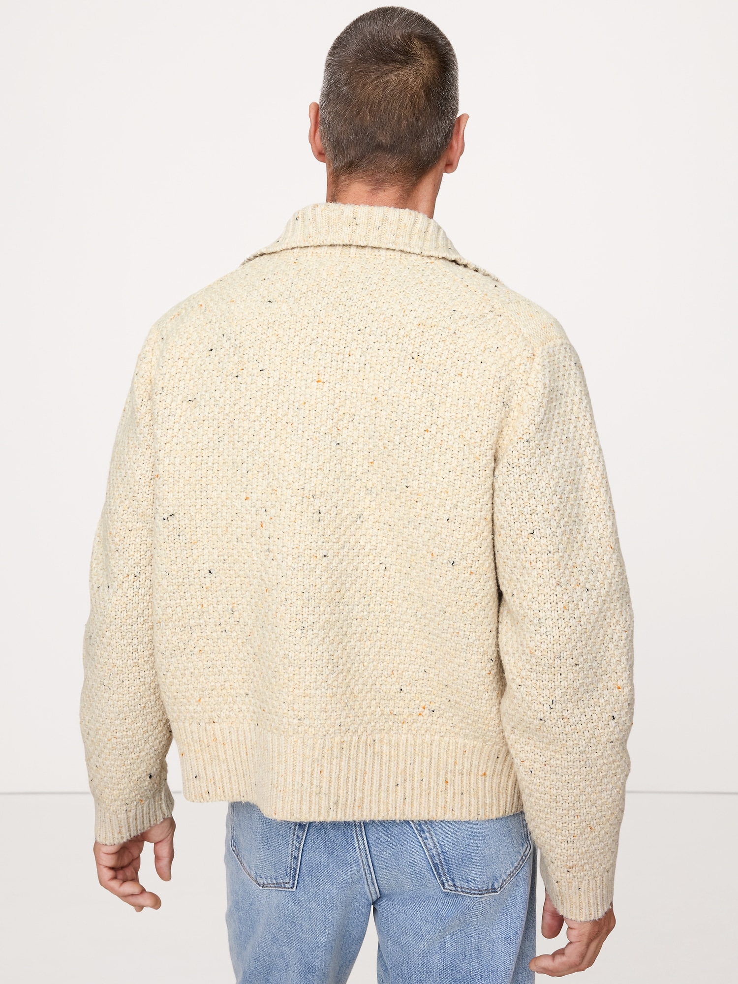 Our take on the patchwork trend, we knit this cardigan sweater with a mix of stitch textures using one of our warmest wool-blend yarns from Italy—one we love for its Donegal-style speckled look.