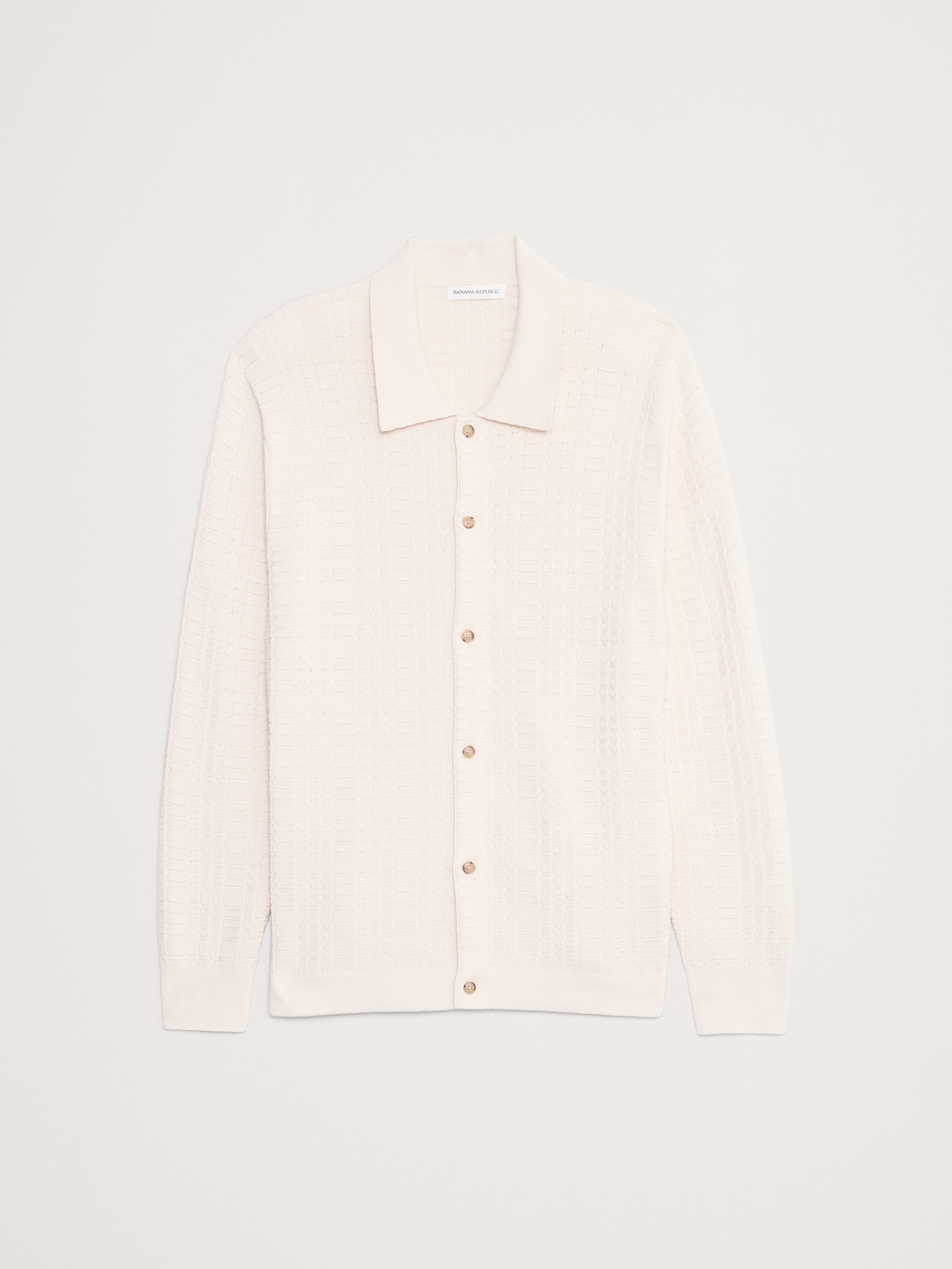 We’re loving sweater polos now (and always), so we designed this cotton one with a full-button front using a special stitch combo to create a plaid texture.