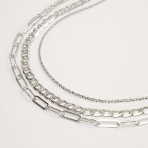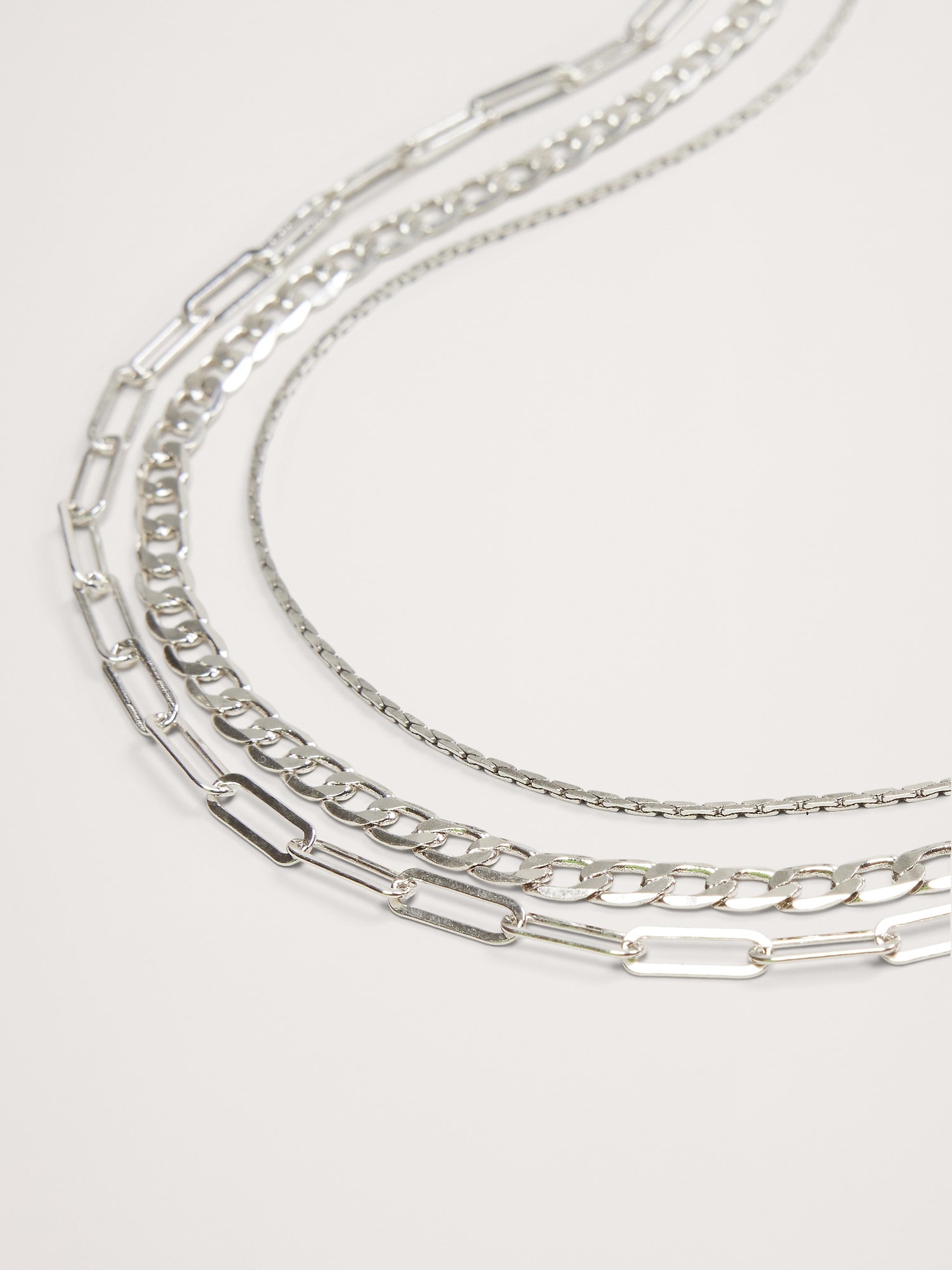 A set of delicate polished chains includes three complementary styles—cobra snake, flat open curb, and elongated paperclip, in endlessly versatile graduating lengths.