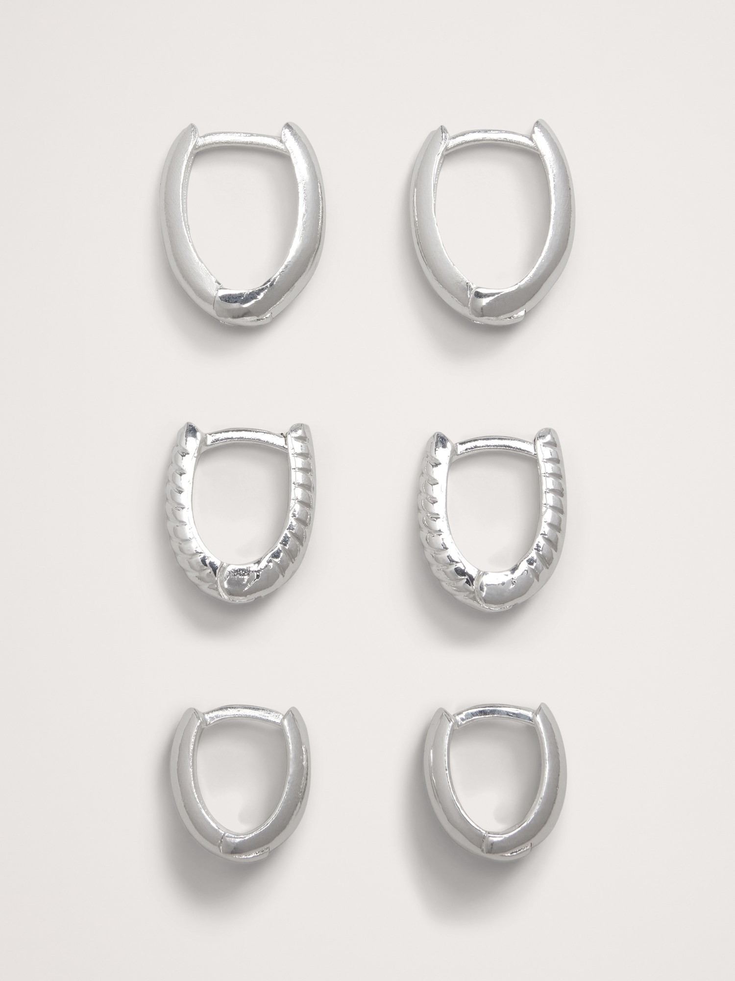 A trio of hinged oval huggie earrings in graduating sizes is made of cast bronze with 12k gold or sterling silver plating.