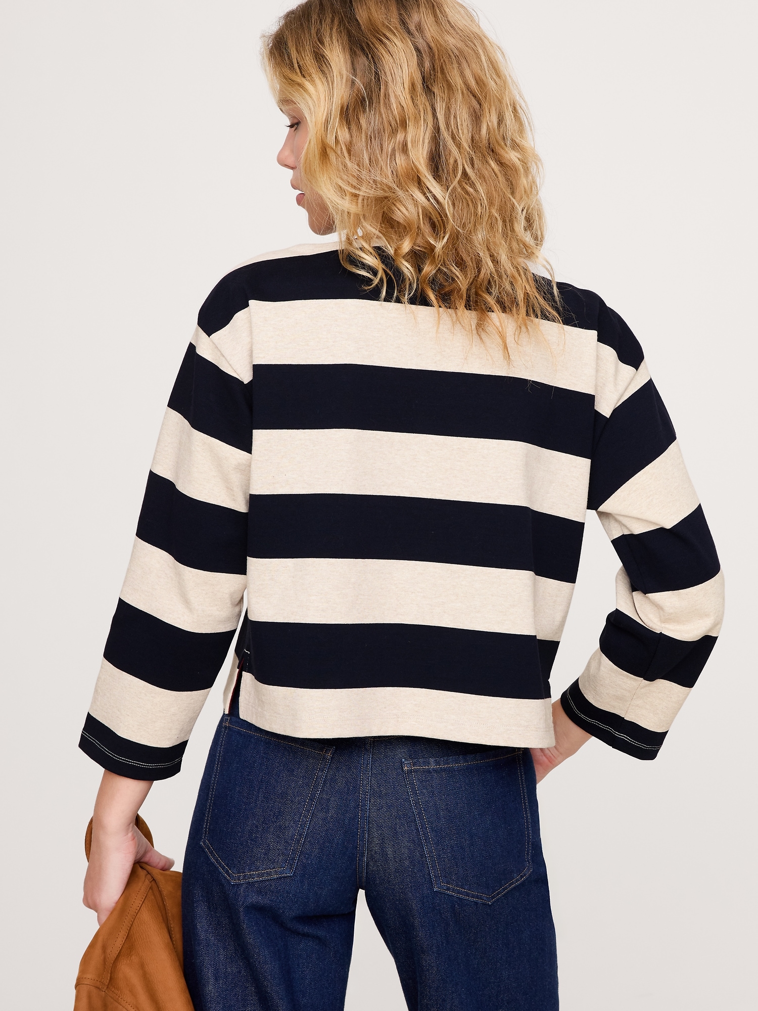 A boatneck t-shirt in a rugged cotton fabric so it’s ideal in cooler seasons.