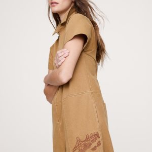 A design love, we cut this utility jumpsuit from sturdy, cotton canvas with a garment wash for softness. Look closely: the embroidery motifs were pulled from a vintage BR scarf of California icons.