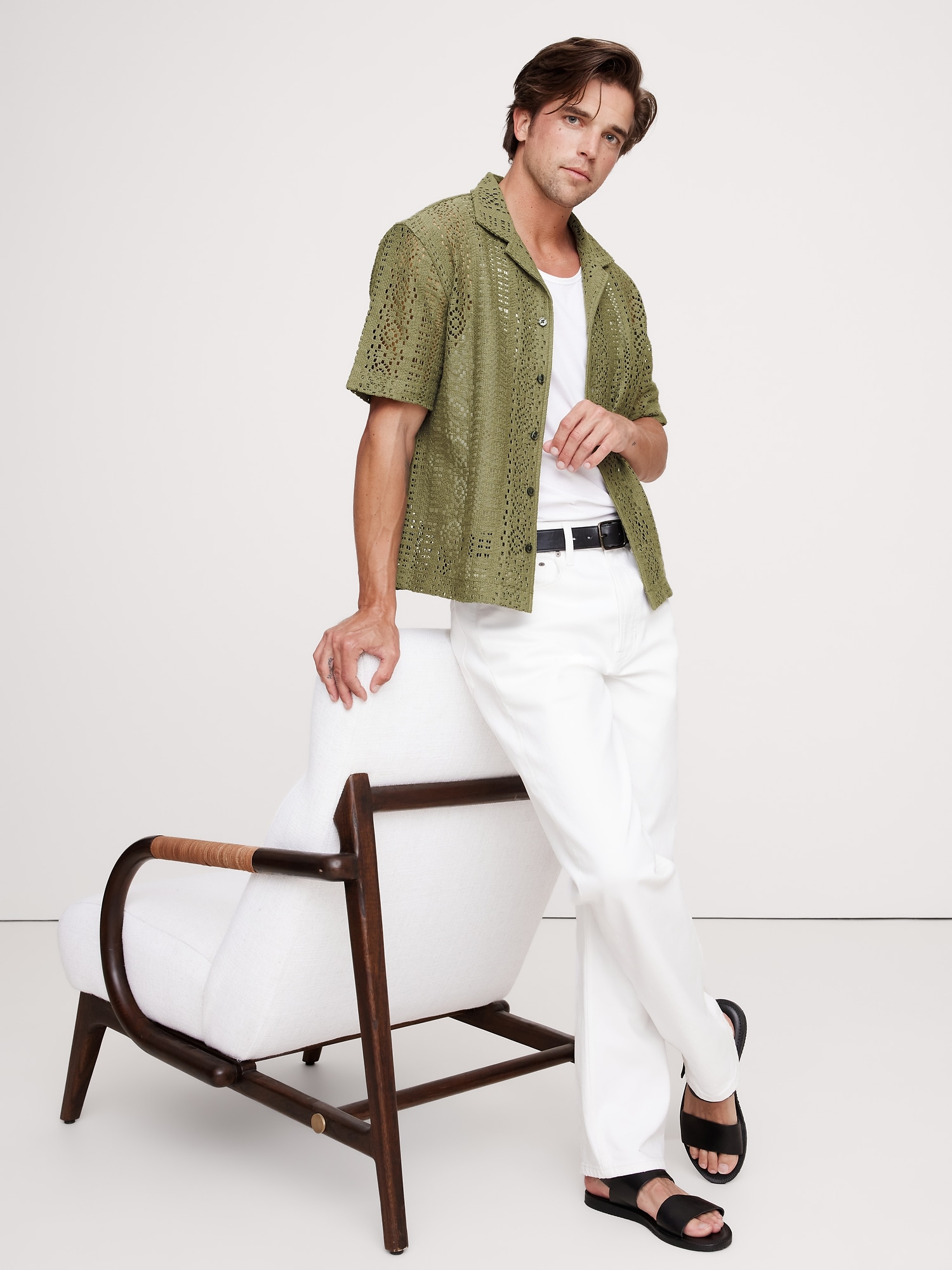 We wanted this resort shirt to capture the feel of the best vintage pieces so we chose a lace fabric that mimics the look of true crochet.