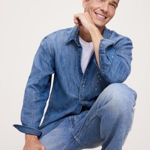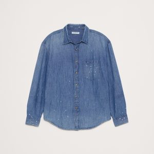 A very cool shirt in a very cool cotton-hemp chambray. This shirt is light enough to layer in cold weather, but warm enough to act as a first layer, with a paint splatter effect for fun.