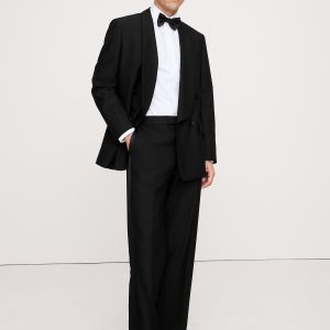 A tuxedo as special as the occasions it’ll see. Note: the Italian wool barathea fabric, the shawl lapel, and the double-breasted front (so it formal).