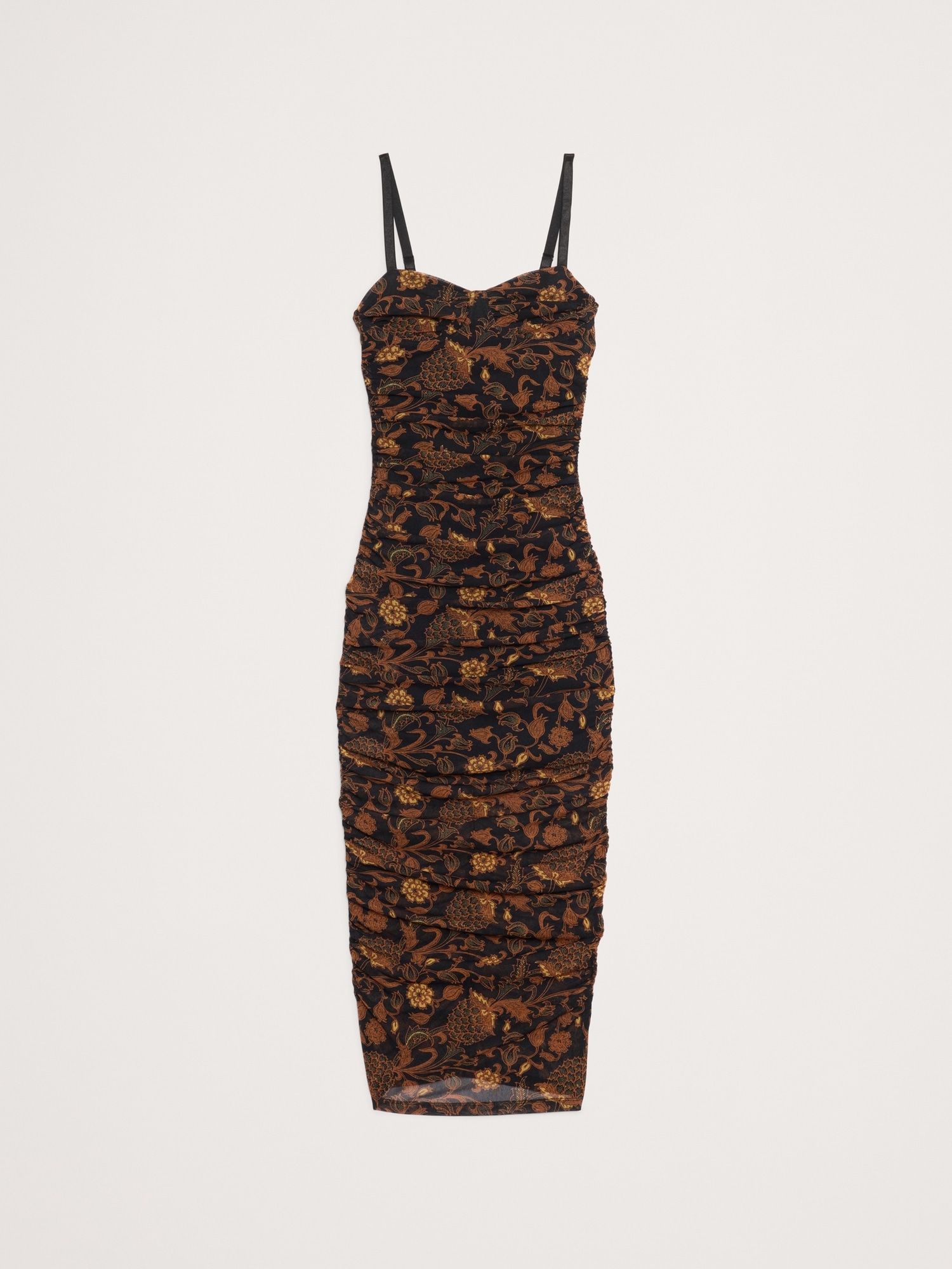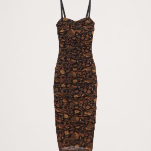 Hard to forget. This slinky midi dress has a corset-inspired bodice and allover ruching, cut in our stretch-mesh for a delightful, next-to-skin feel.
