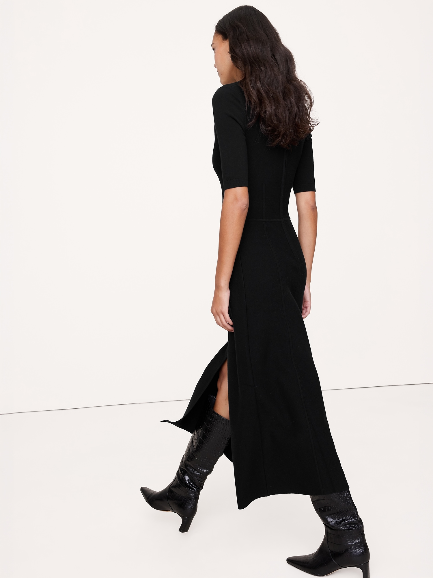 A dress that says \”leave it to me\”. We cut this midi dress in our high-stretch Sculpted yarn, here with a Milano stitch so it lays smooth against the skin.