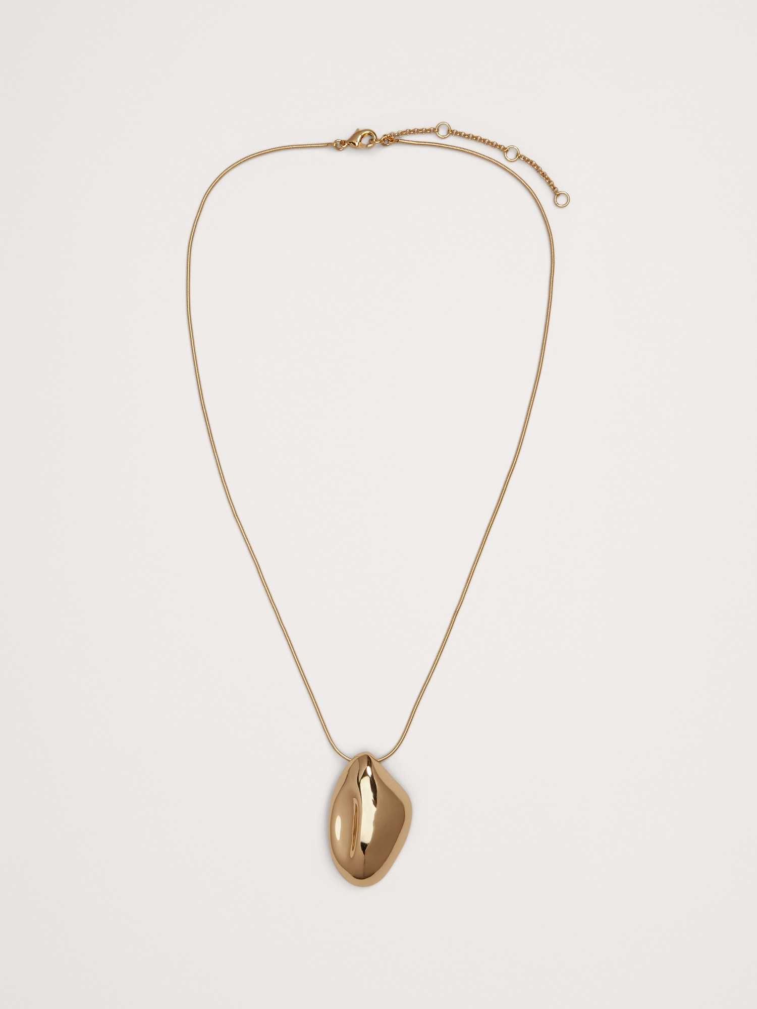A sculptural contoured pendant is cast in brass parts and brazed together. The hollow gold finished or silver-plated pendant is paired with an adjustable length snake chain.
