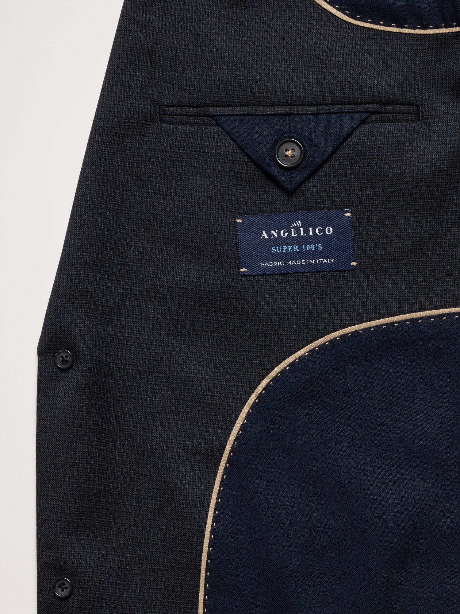 Top-tier tailoring, we finished this blazer with intricate pick stitching and a full lining for a traditional, timeless look. A small surprise: this handsome Italian wool has a micro houndstooth print in a rich, navy blue color.