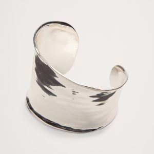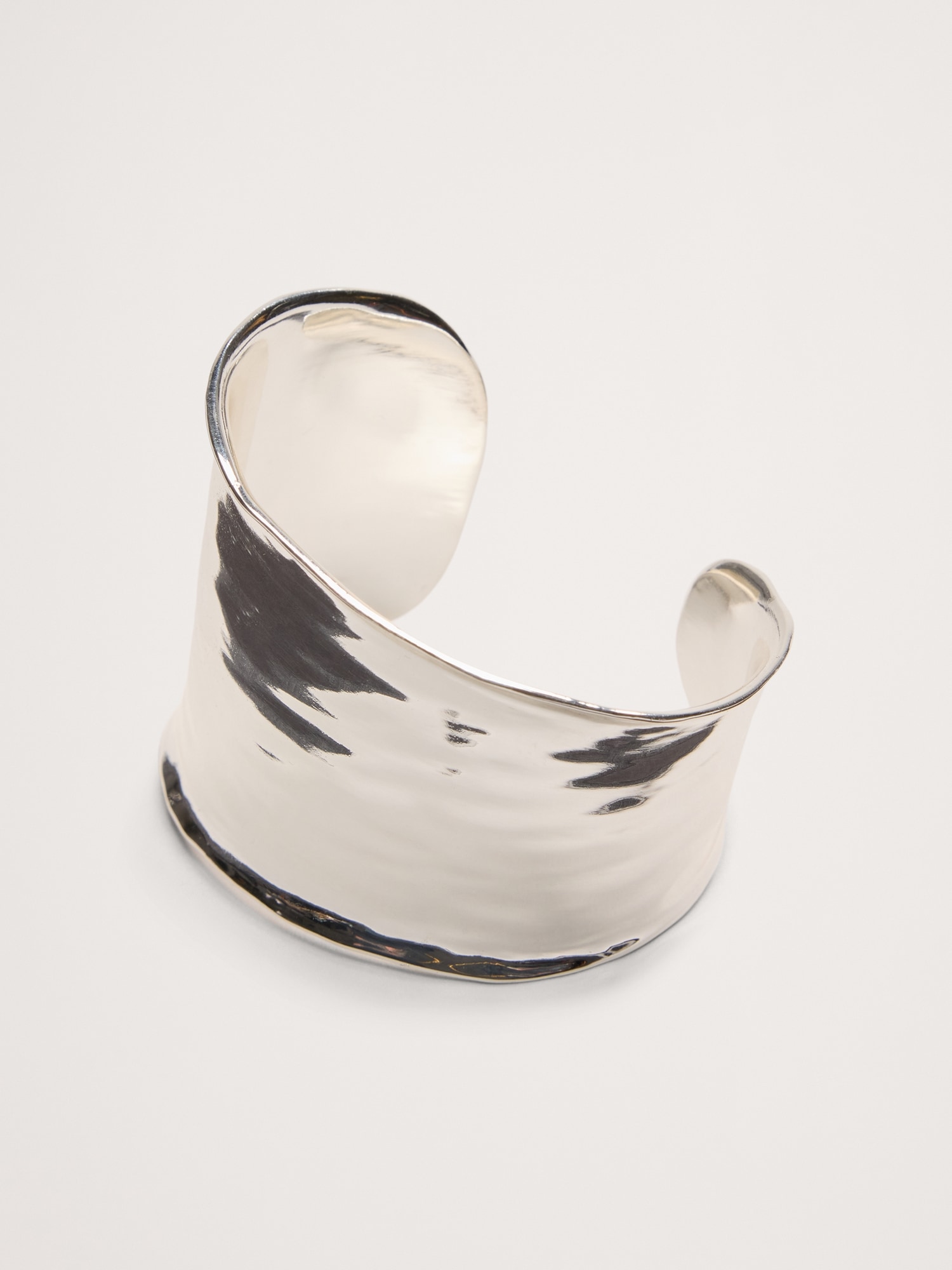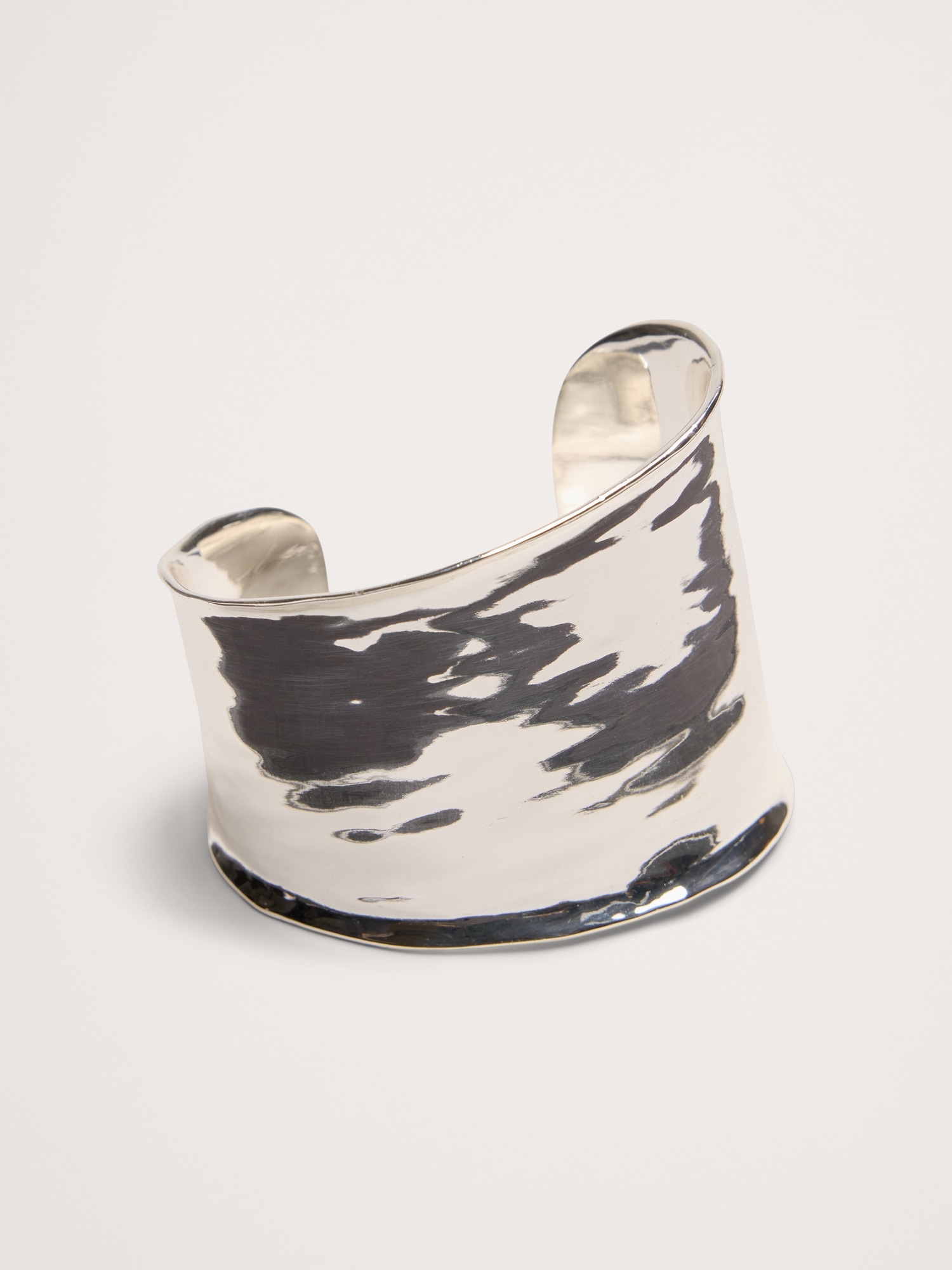 A slanted profile, subtle undulating texture, and curving edges adorn this highly polished, wide, modern cuff. Silver-plated and carefully polished for perfect shine.
