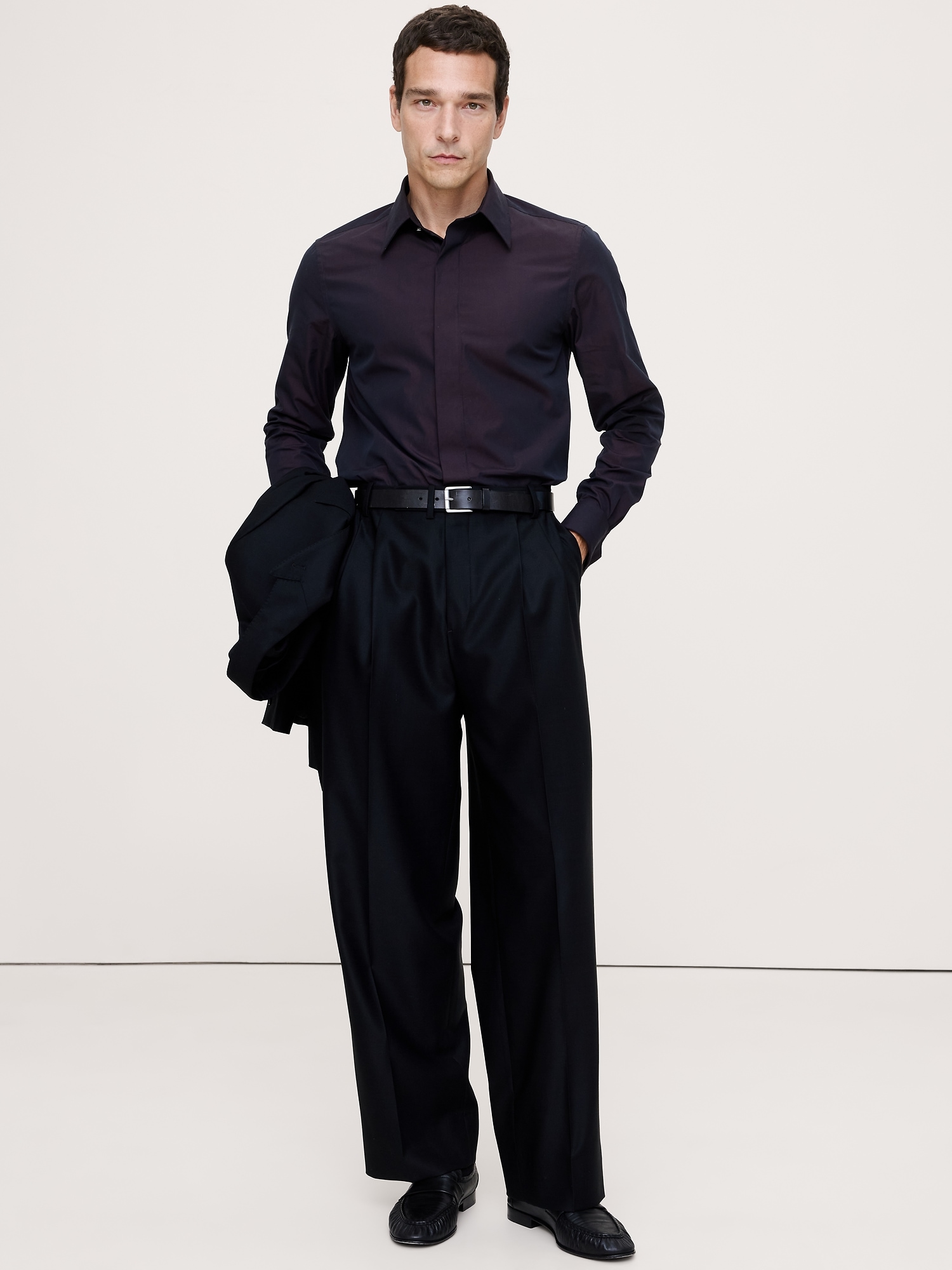 Look closely: this tuxedo dress shirt is cut from a premium cotton poplin, selected for its two-tone weave and subtle sheen, with a covered button placket for a clean and timeless look.