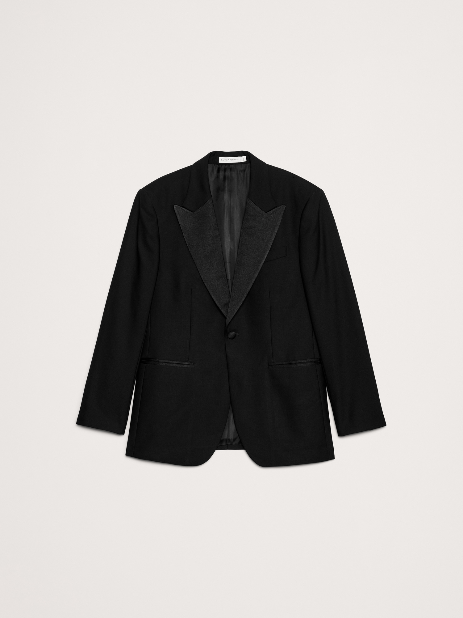 Peak lapel with single button front.