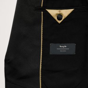 A tuxedo as special as the occasions it’ll see. Note: the Italian wool barathea fabric, the silk faille lapel and covered buttons, and the sharp, roped shoulder construction (so it formal).