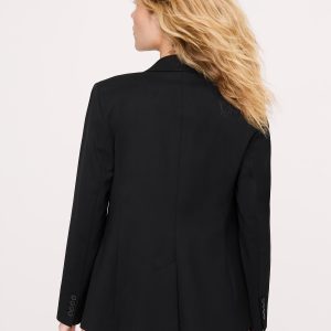 Notch lapel with 1-button front closure.