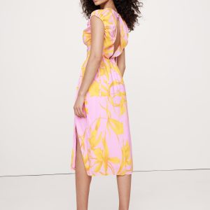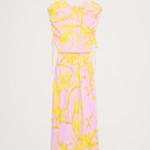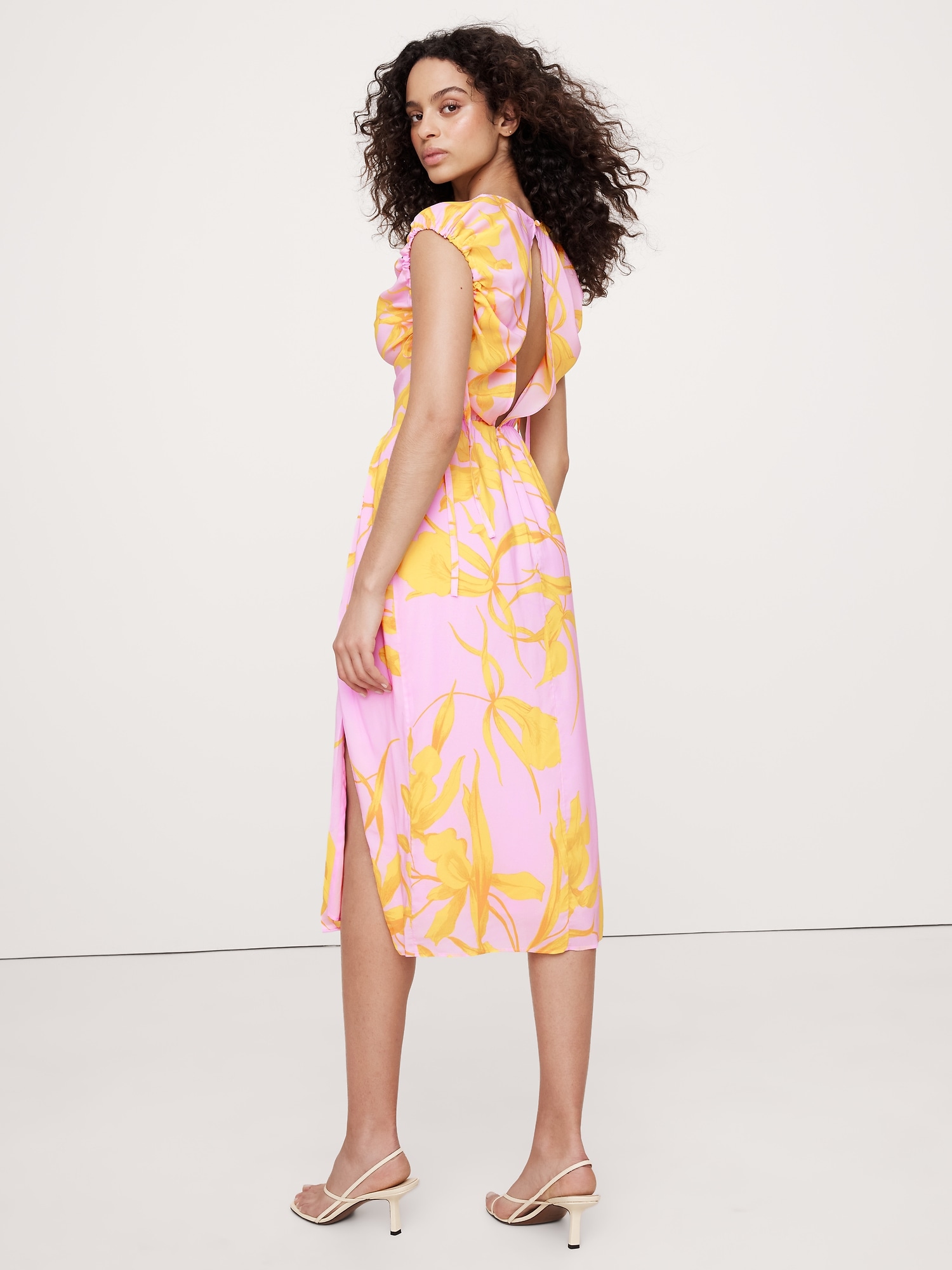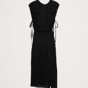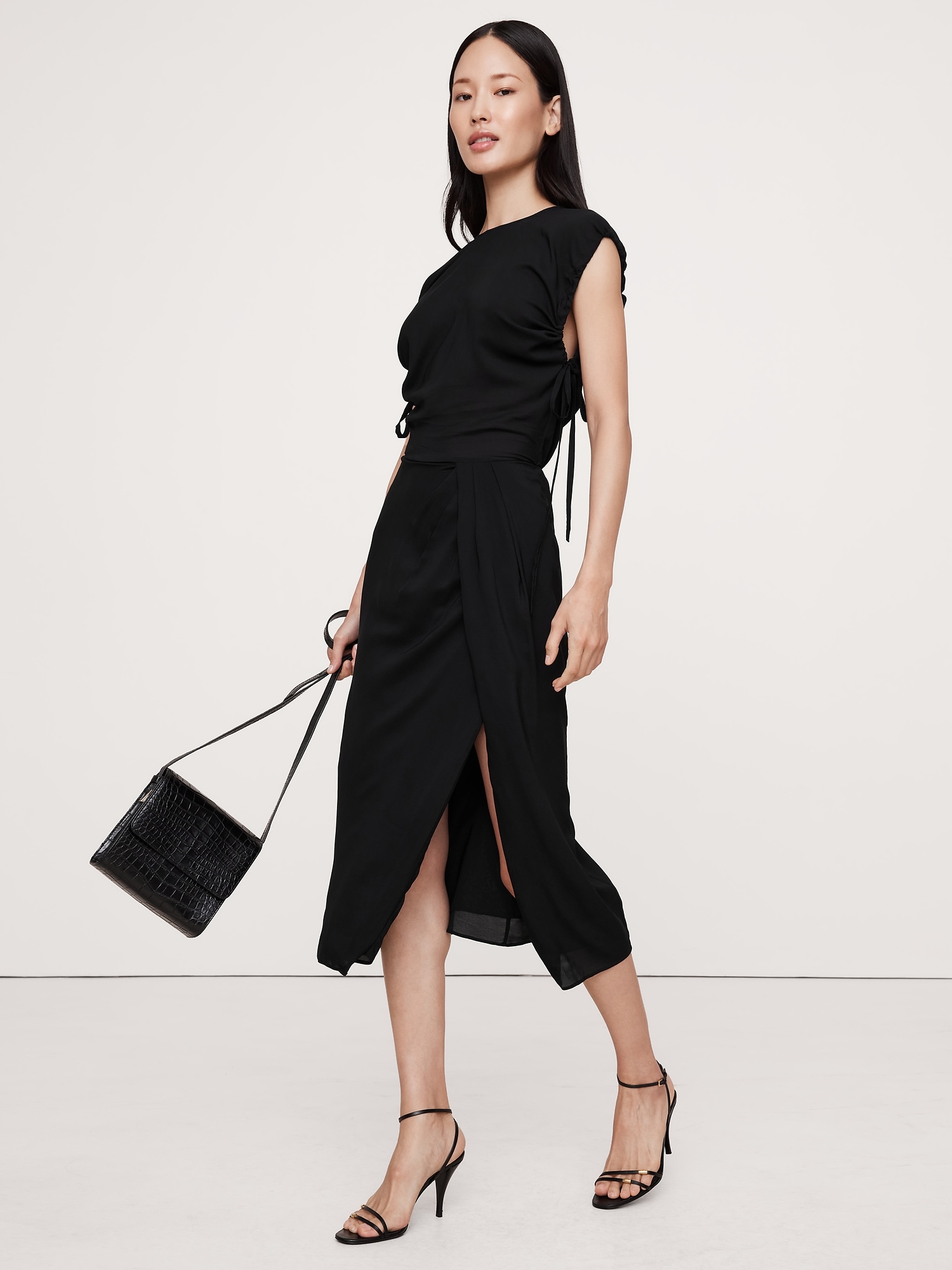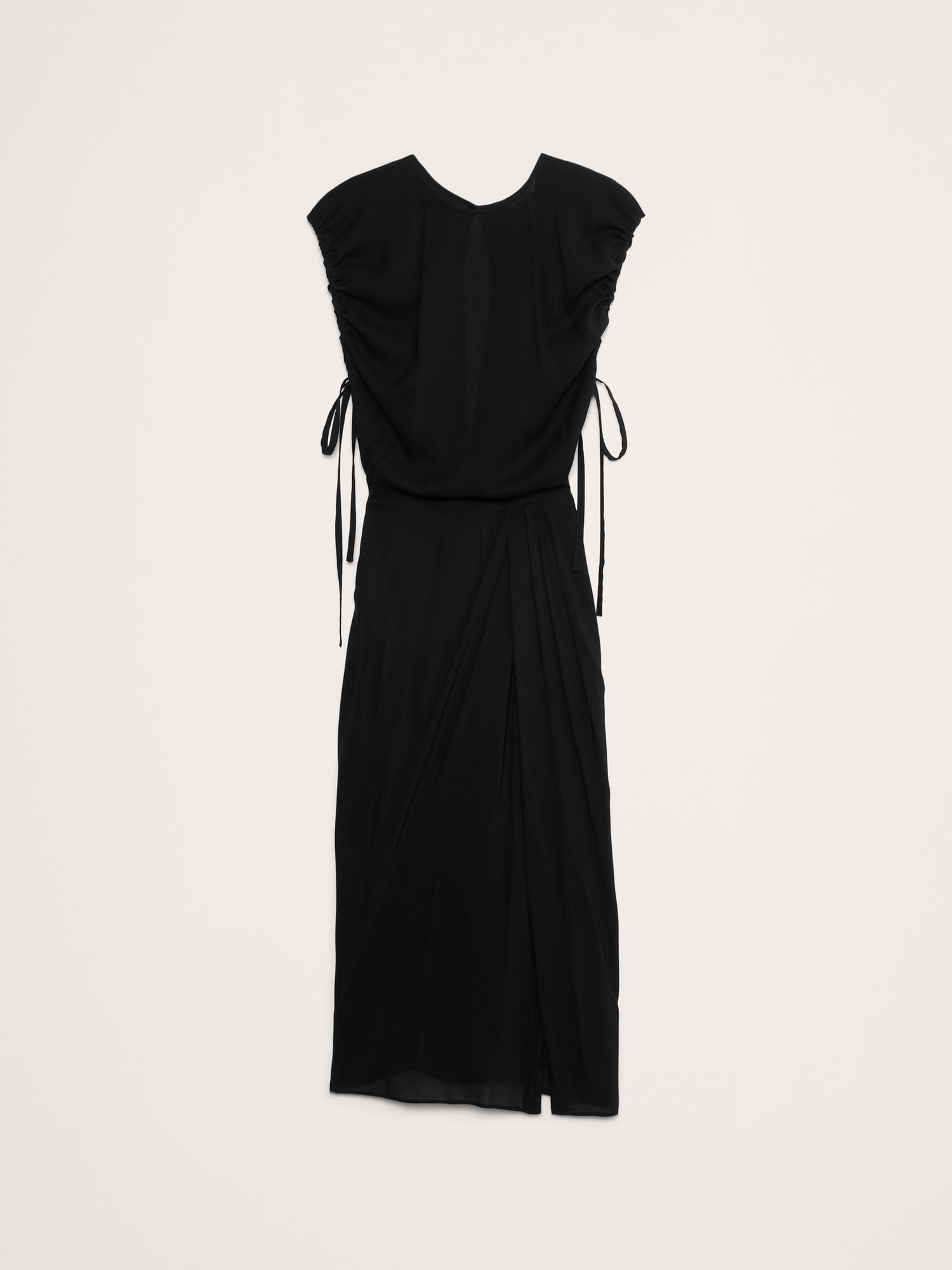 A modern silhouette with artful ruching, ties at the sleeves, and an open back. Another thing we love? It’s cut from a viscose crepe that feels light-as-chiffon with a subtle stretch.
