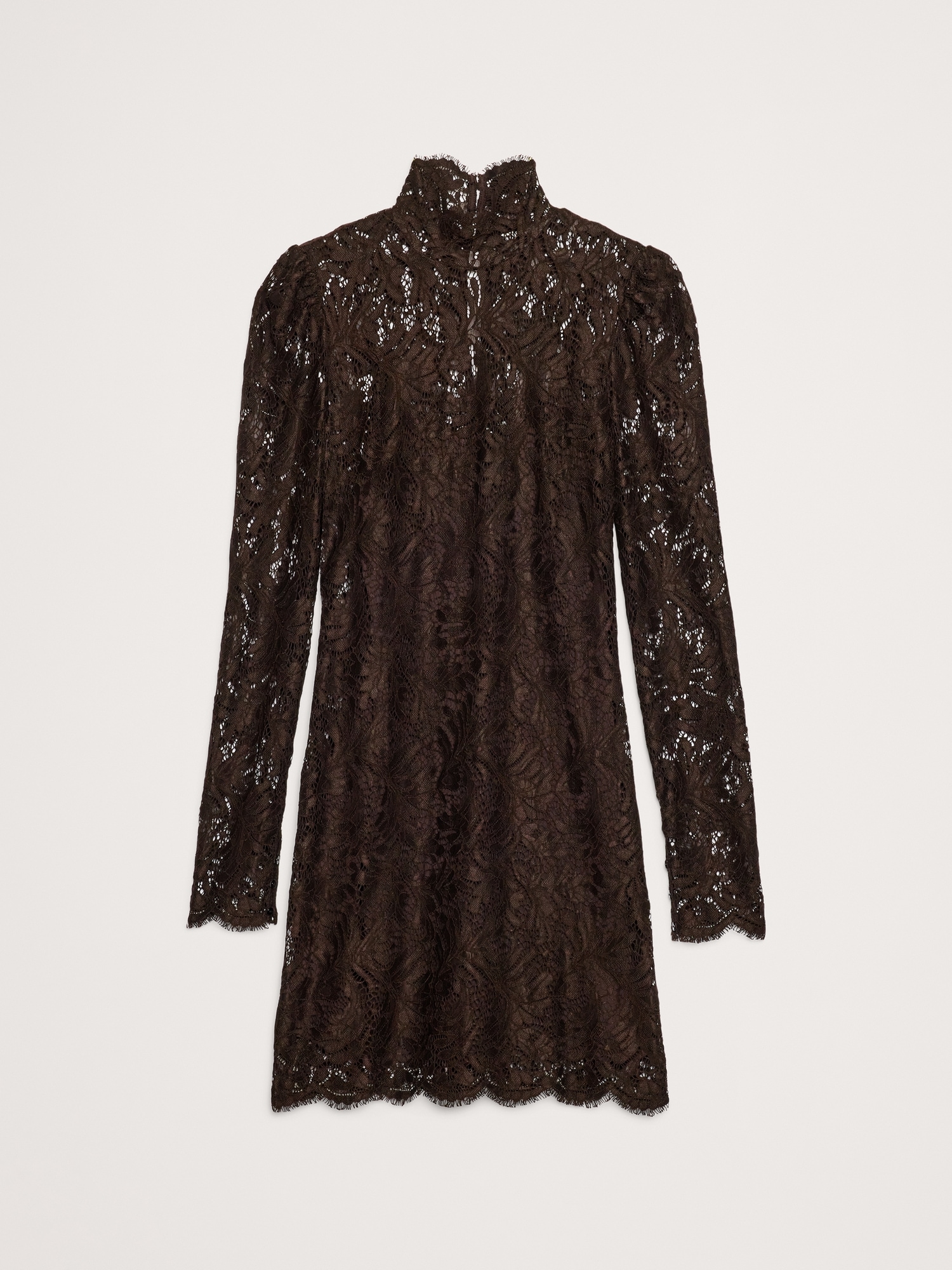 Cut from a stretchy knit lace, this dress feels as effortless as a T-shirt but looks ready for a cocktail event. Wear with the included slip or style with tights and a bodysuit. Sheath Fit: Sits close to the body with a straight skirt. Mock neck with button-keyhole at back. Camisole slip lining. #817720