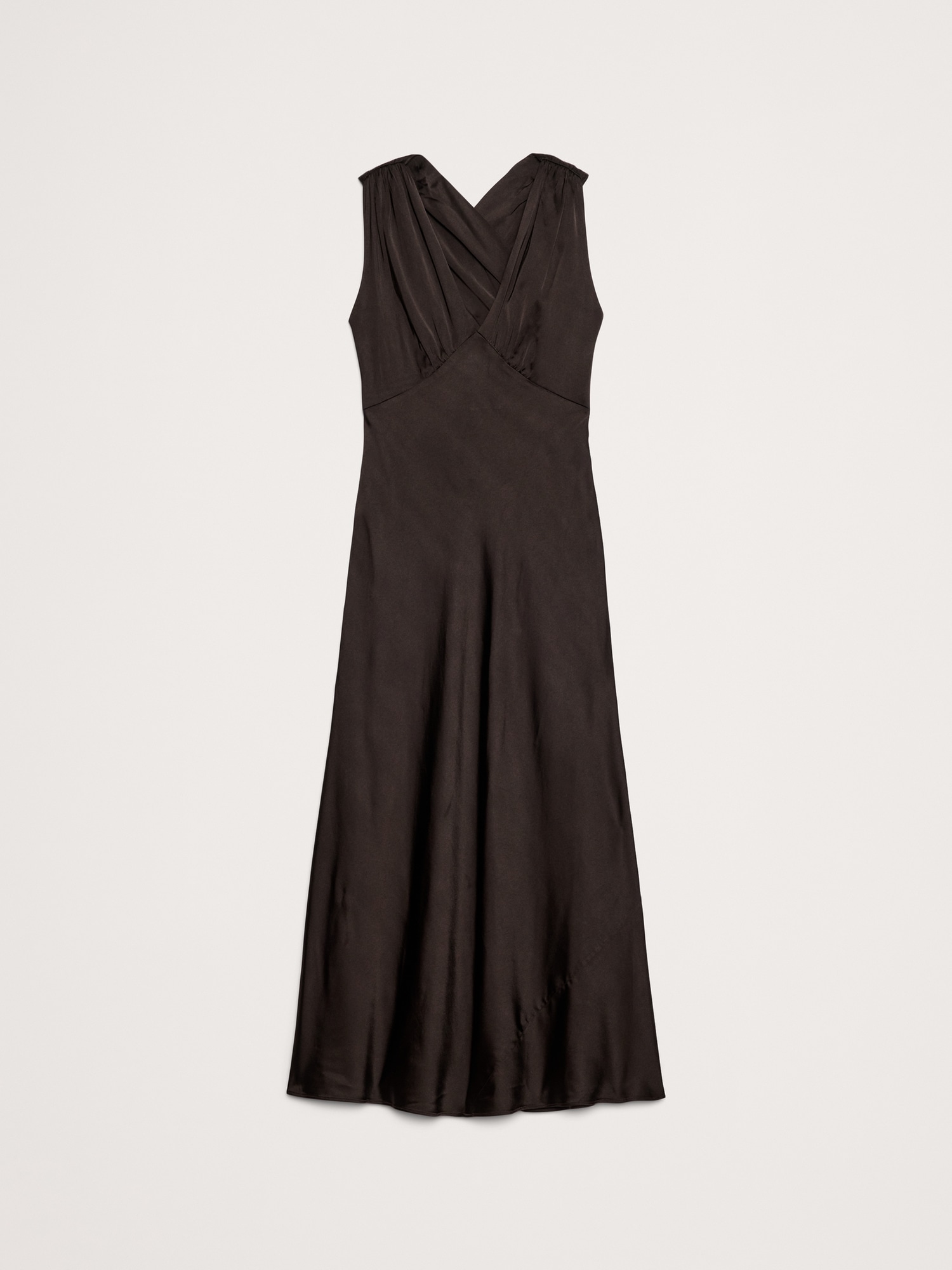 Party in the back. This stretch-satin dress is all about the details: a v-neck, flattering ruched bodice, open back, and wide crossover straps. In place of a zipper, our designer added a delicate drawstring detail for a custom fit.