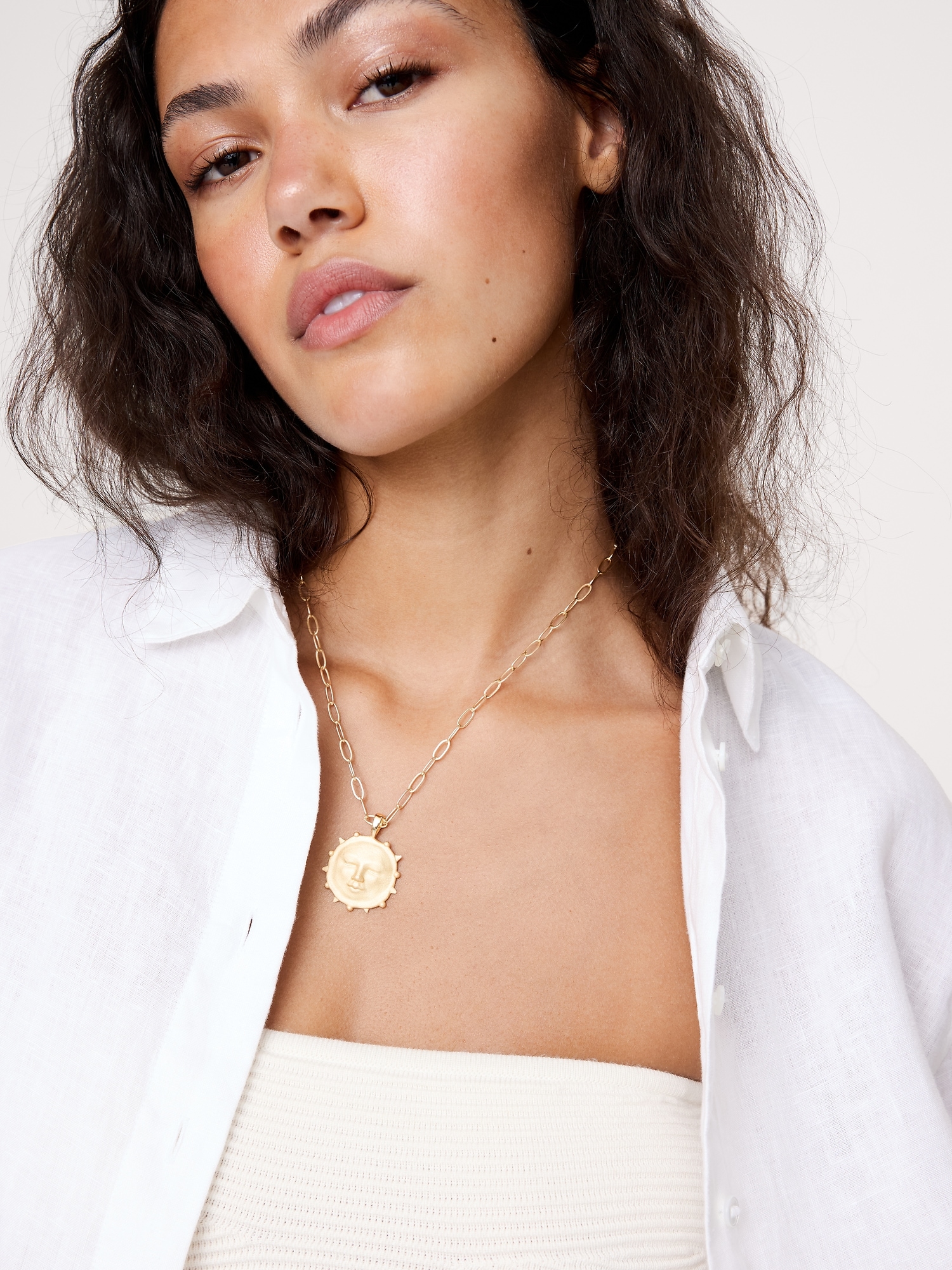 The Sun—the ultimate guiding star. Finished with a matte gold on the front and a shiny back with the sun and moon logo.