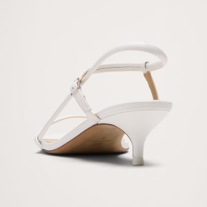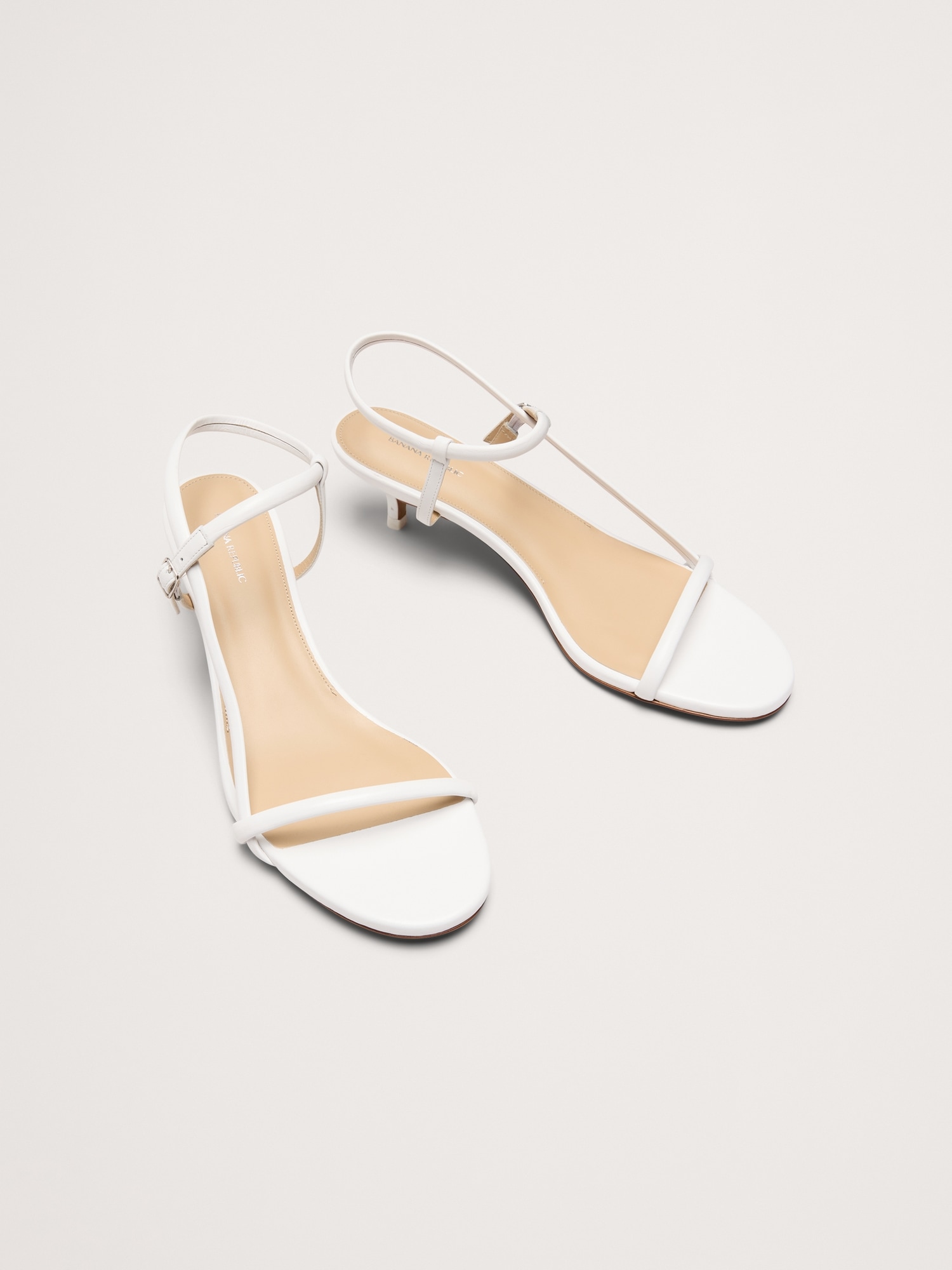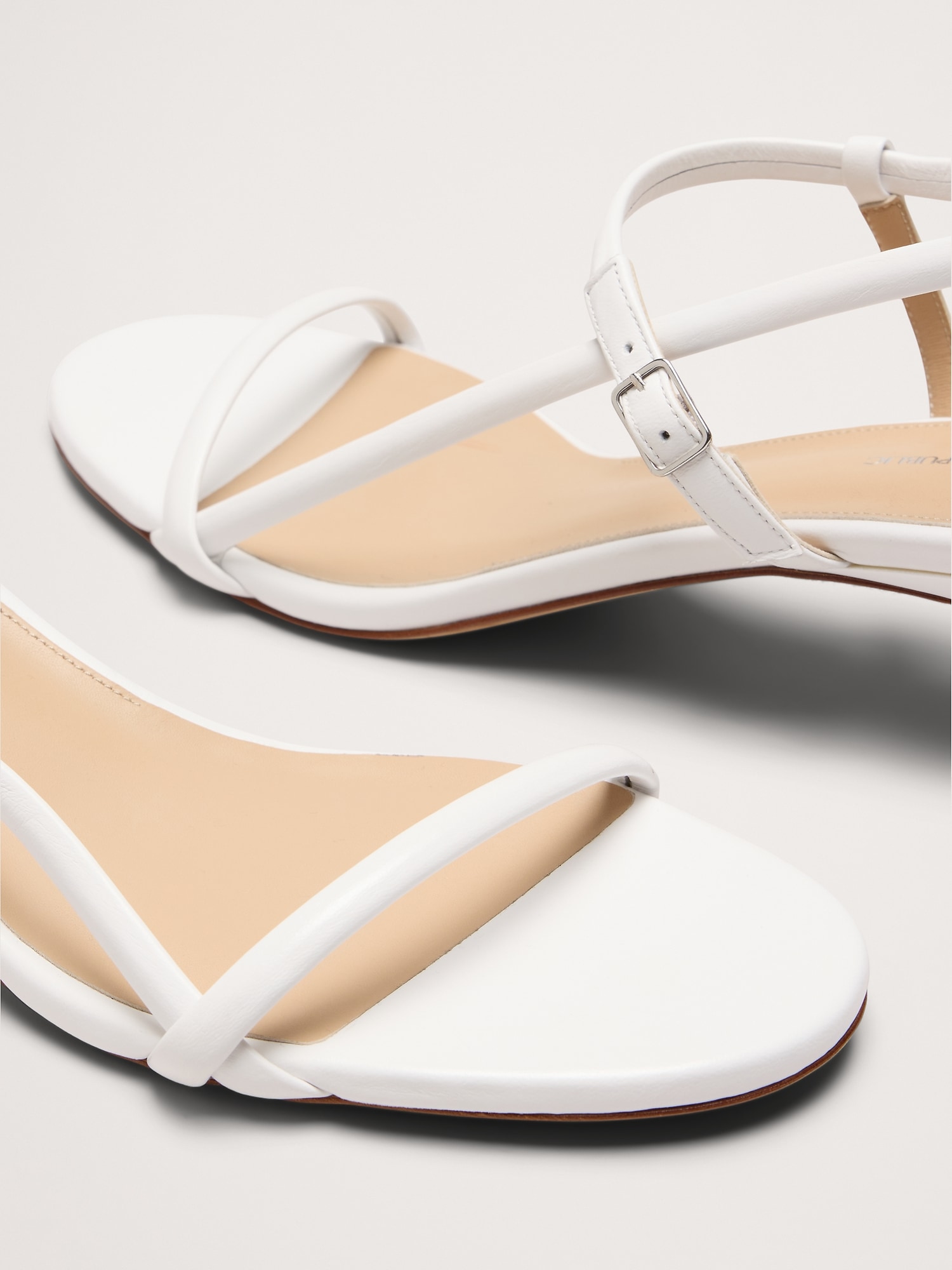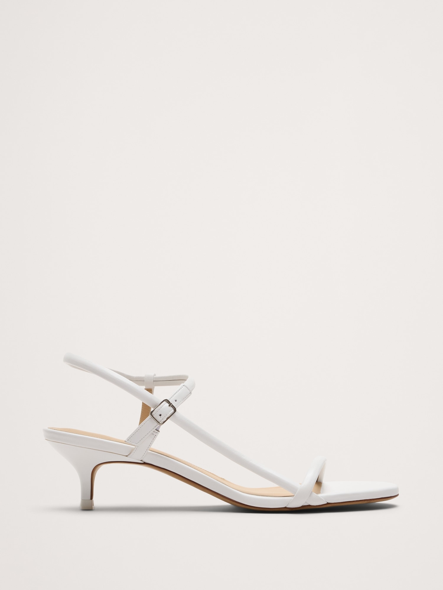 Set atop a modest kitten heel, these sleek almond-toe sandals are crafted with puffy, Italian leather straps that wrap around the foot and ankle for a secure fit.