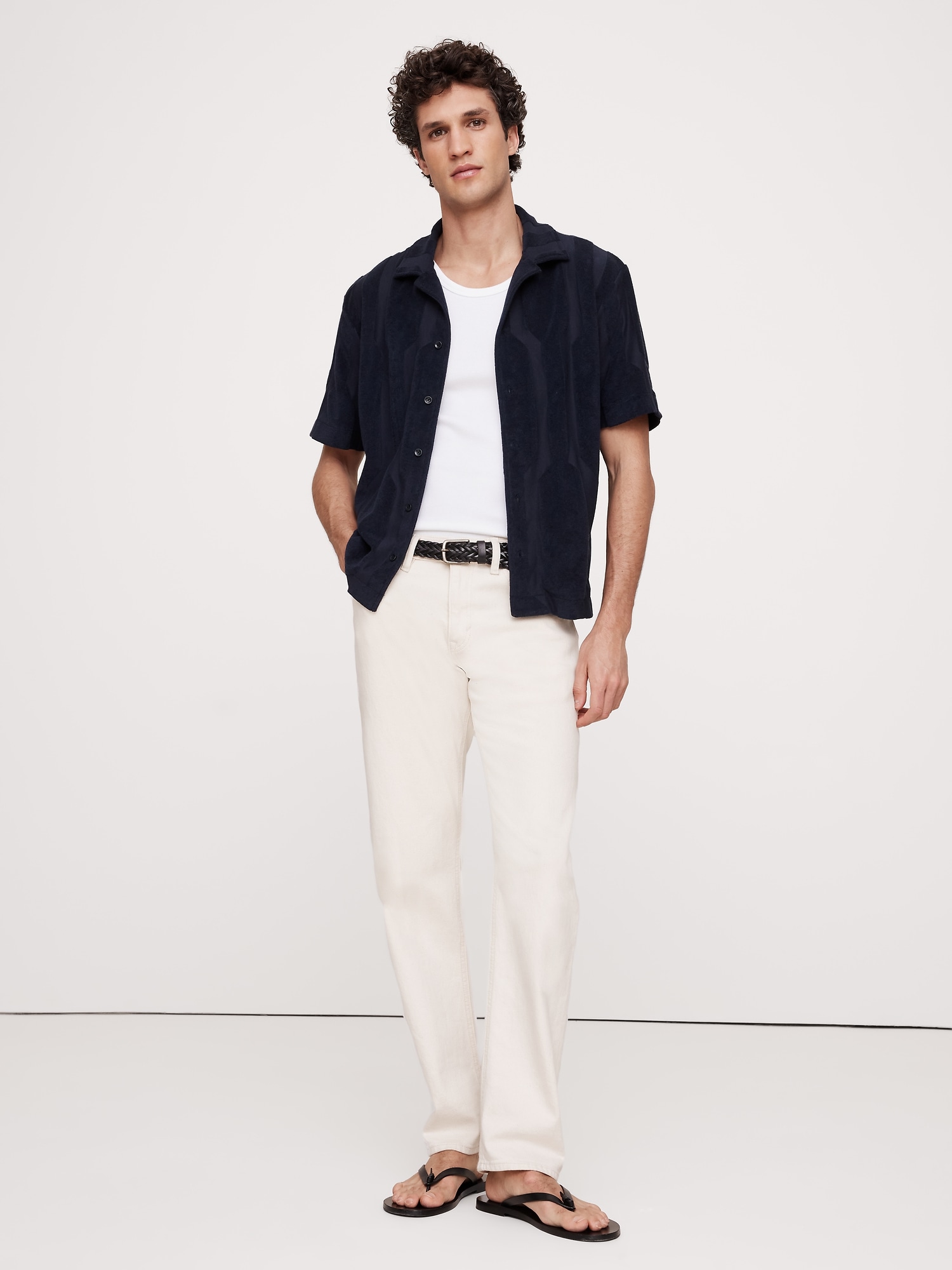 A classic resort shirt, made for warm-weather in a toweling terry fabric in a geometric pattern.