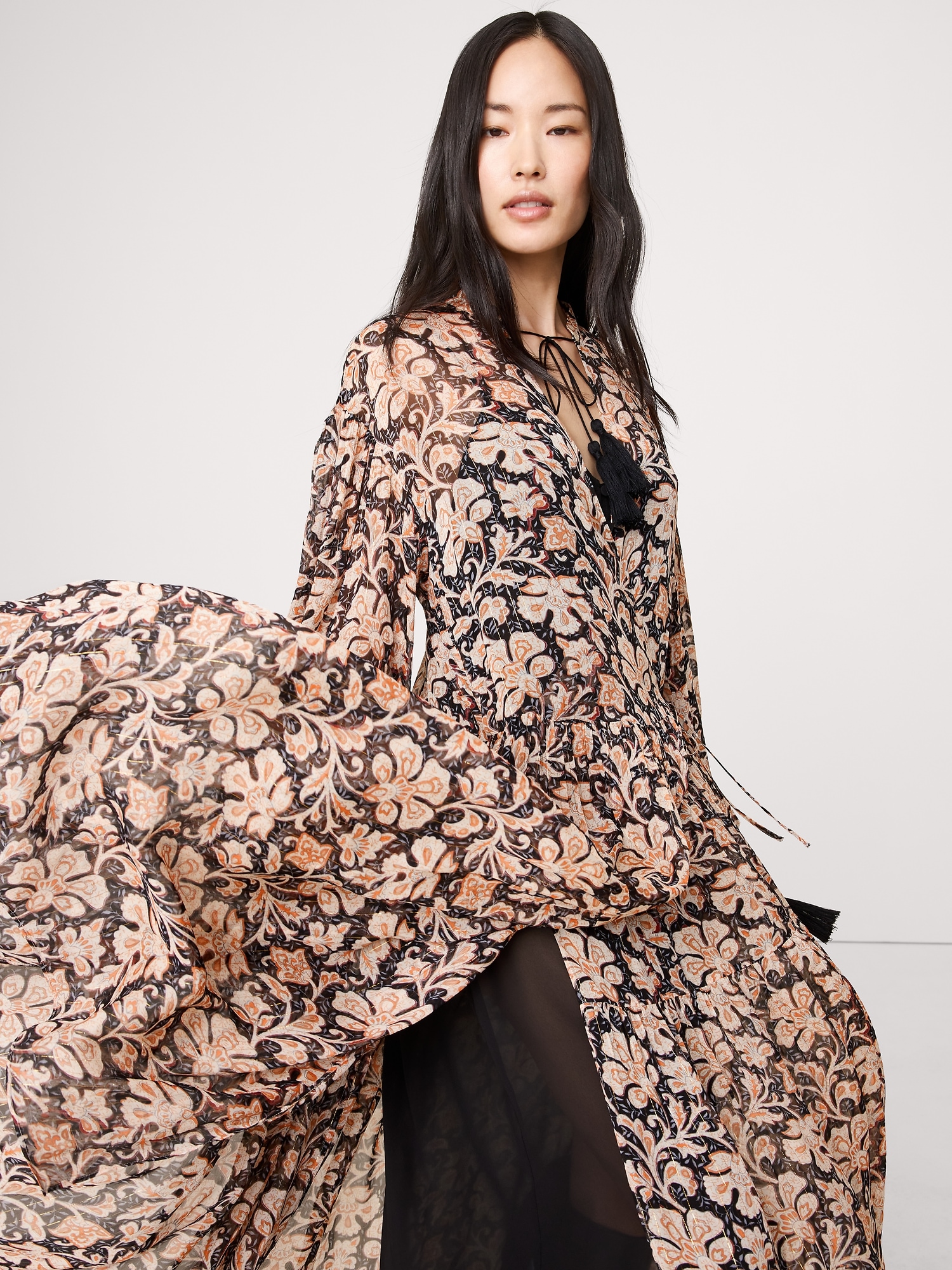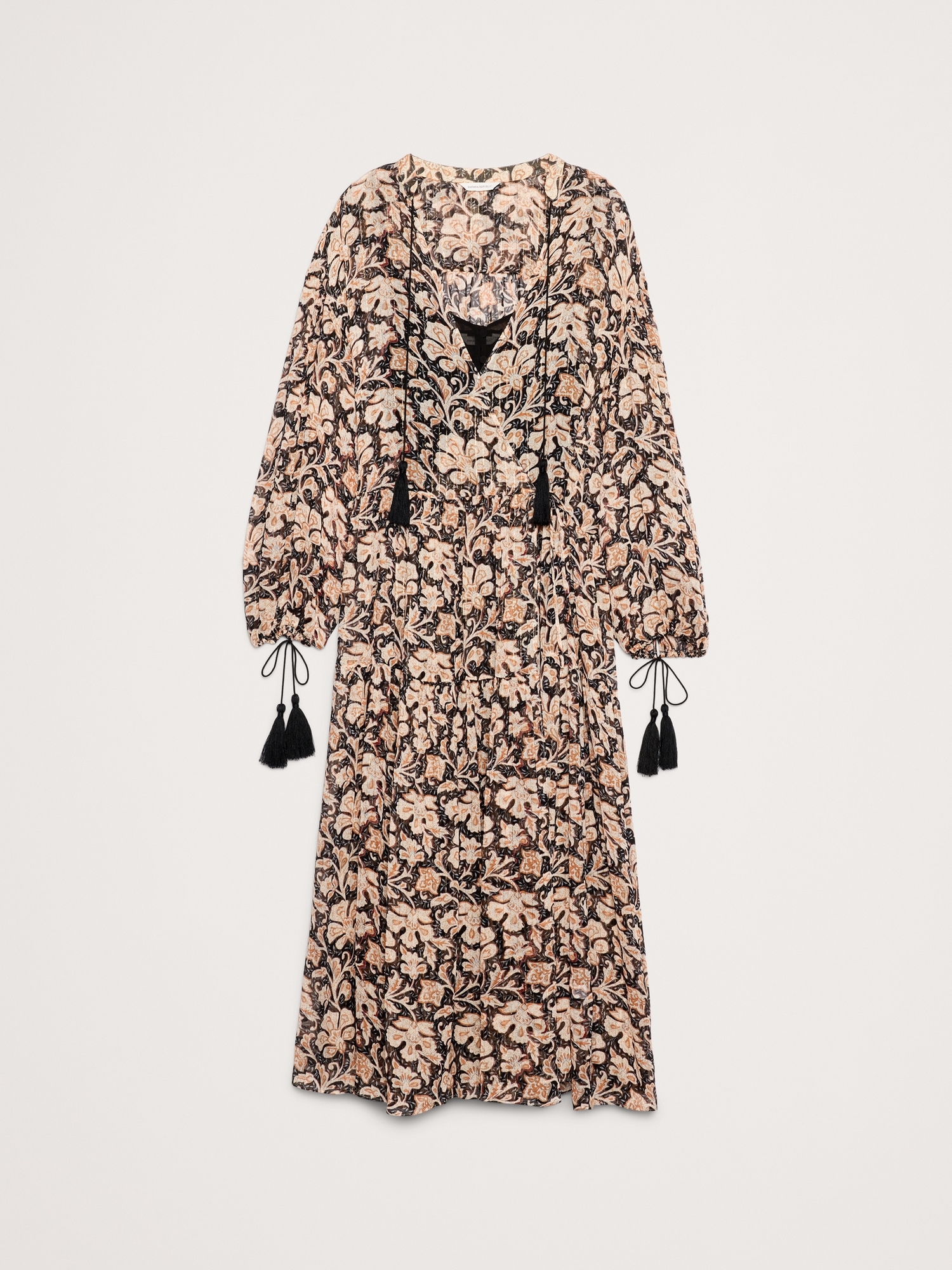 Look closely: this tiered maxi dress is cut from lighter-than-air chiffon with subtle, metallic lurex stripes. Plus, we added a camisole slip lining and tassels at the collar and cuffs. Shift fit: Relaxed shoulders, straight through bust, waist and hip with a straight skirt. Banded collar with tassel tie closure. Camisole slip lining. #818164