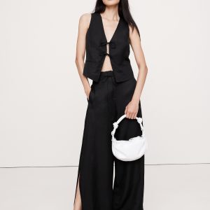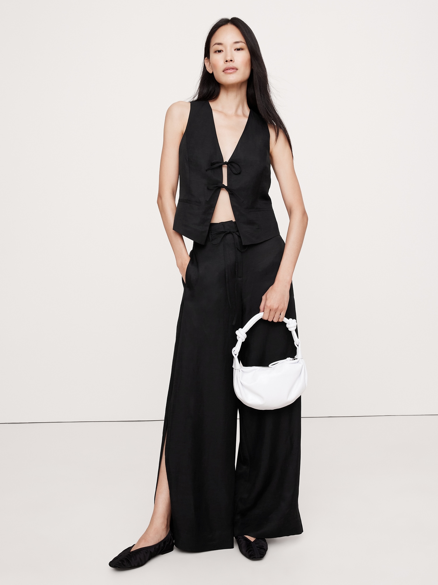 An easy tie-front vest, cut in a silky blend of viscose and linen—an ideal choice in hot, humid weather. Make it a set with the matching pant.