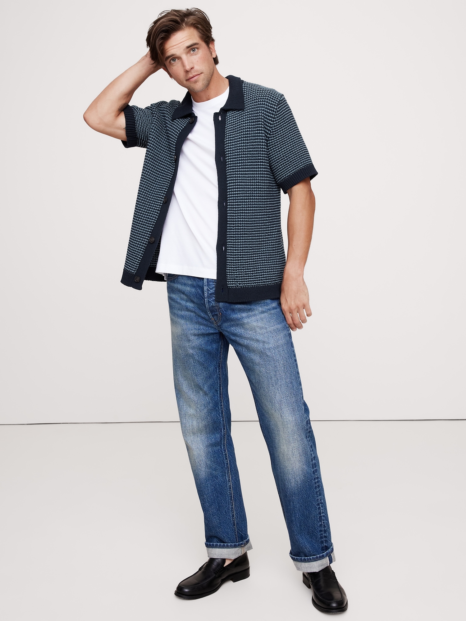 Vintage-inspired, we cut this sweater with a polo collar, button front and two-color waffle-knit stitch to mimic the retro look of sweater polos from the 1960s and 1970s. Crafted in a light cotton-blend yarn.
